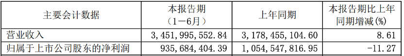 公司上半年度實(shí)現(xiàn)營(yíng)業(yè)收入3,451,995,552.84元,同比增長(zhǎng)8.61%;實(shí)現(xiàn)歸屬于上市公司股東的凈利潤(rùn)935,684,404.39元,同比下降11.27%。