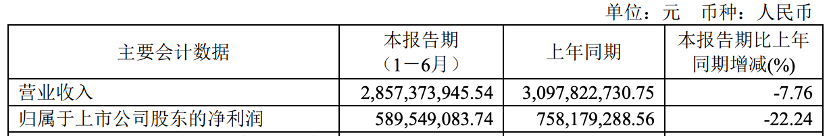 公司上半年?duì)I業(yè)收入為2,857,373,945.54元,同比下降7.76%;歸屬于上市公司股東的凈利潤(rùn)為589,549,083.74元,同比下降22.24%。