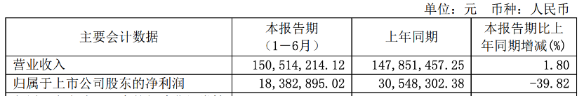 公司上半年?duì)I業(yè)收入為150,514,214.12元,同比增長(zhǎng) 1.80%;實(shí)現(xiàn)歸屬于上市公司股東的凈利潤(rùn)18,382,895.02元,同比下降39.82%。