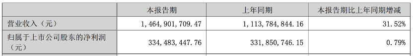 公司上半年?duì)I業(yè)收入為14.65億元,同比增長(zhǎng)31.52%;歸屬于上市公司股東的凈利潤(rùn)3.34億元,同比增長(zhǎng)0.79%。