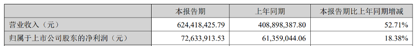 公司上半年?duì)I業(yè)收入為6.24億元,同比增長(zhǎng)52.71%;歸屬上市公司股東的凈利潤(rùn)7263萬(wàn)元,同比增長(zhǎng)18.38%。