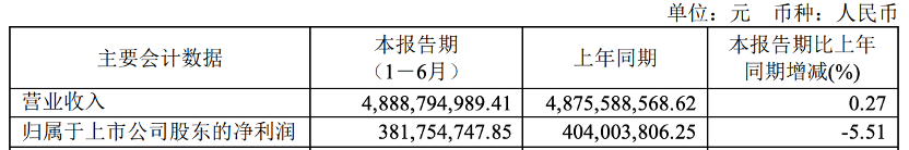 公司上半年?duì)I業(yè)收入為48.89億元,同比增長(zhǎng)0.27%;歸屬于上市公司股東的凈利潤(rùn)3.82億元,同比下降5.51%。
