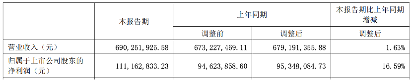 公司上半年?duì)I業(yè)收入為入6.90億元,同比增長(zhǎng)1.63%;歸屬于上市公司股東的凈利潤(rùn)1.11億元,同比增長(zhǎng)16.59%。