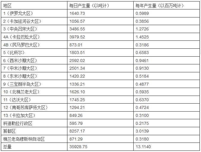 下方的圖表展示的是菲律賓全國(guó)各地區(qū)的廢物產(chǎn)生量,數(shù)據(jù)的來源是國(guó)家固廢管理委員會(huì)秘書處。數(shù)據(jù)是通過計(jì)算各地區(qū)人均廢物產(chǎn)生量和人口的乘積得到的。平均來說,在城市區(qū)域和農(nóng)村區(qū)域,人均廢物產(chǎn)生量分別為0.5kg/天和0.3千克/天。在首都區(qū),也就是馬尼拉大都市區(qū)的所在地,人均廢物產(chǎn)生量最高,為0.71千克/人/天。