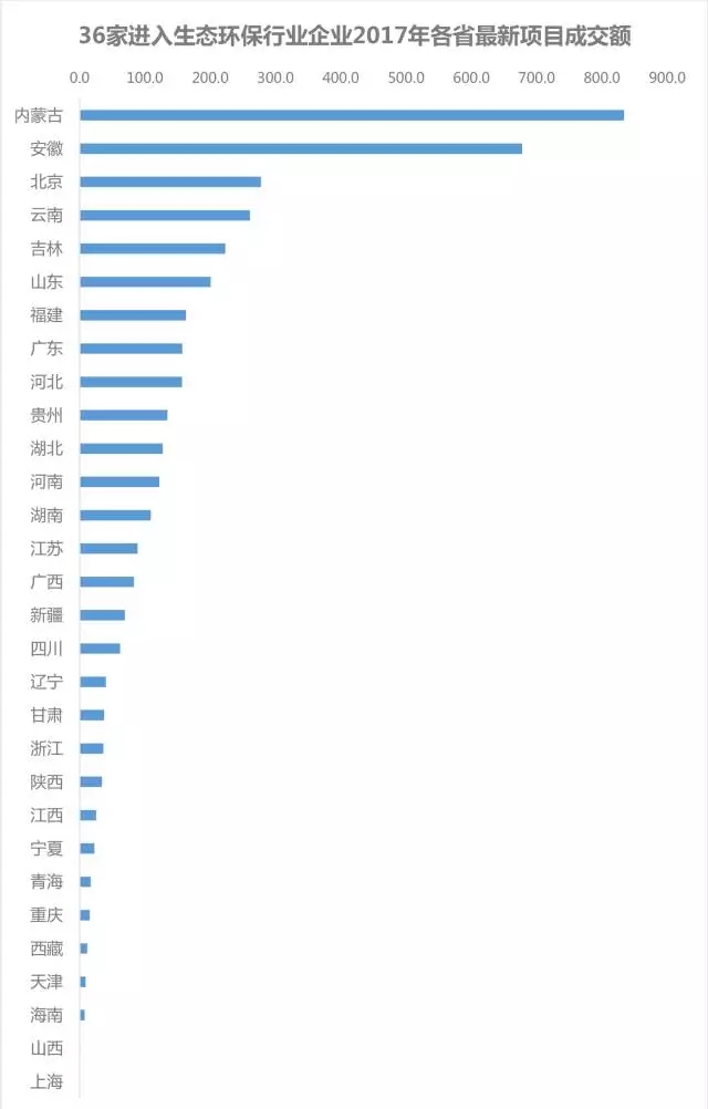通過以這36家涉足生態(tài)環(huán)保行業(yè)的企業(yè)為代表,從他們今年在全國范圍內(nèi)的落單情況,可以看出競爭較為激烈的除了經(jīng)濟水平較高的華東地區(qū),還有較為欠發(fā)達的地區(qū),包括環(huán)境污染較為嚴重的西北和水源地較多的西南地區(qū)。