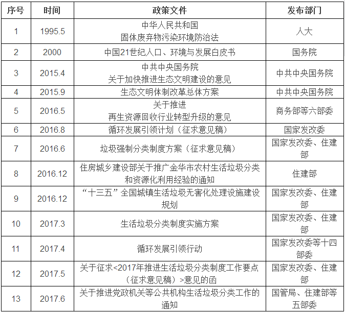 為推動(dòng)我國(guó)垃圾分類(lèi)實(shí)施,國(guó)家陸續(xù)出臺(tái)了不少相關(guān)政策。早在1995年發(fā)布、2016年修訂的《中華人民共和國(guó)固體廢棄物污染環(huán)境防治法》中,第37條就已經(jīng)規(guī)定:“城市生活垃圾應(yīng)當(dāng)逐步做到分類(lèi)收集、貯存、運(yùn)輸及處置”;