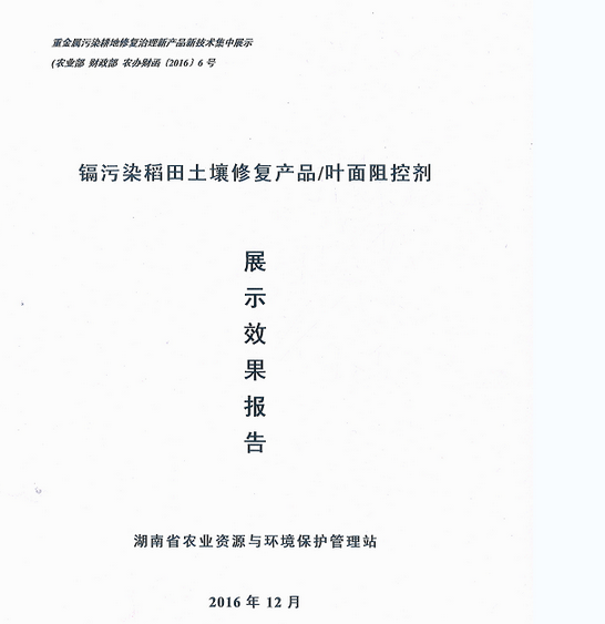 2016年參加由農(nóng)業(yè)部、財(cái)政部組織的重金屬污染耕地修復(fù)治理新產(chǎn)品新技術(shù)集中展示,通過專家篩選和評(píng)審,早晚稻平均稻米降隔率≥50%;
