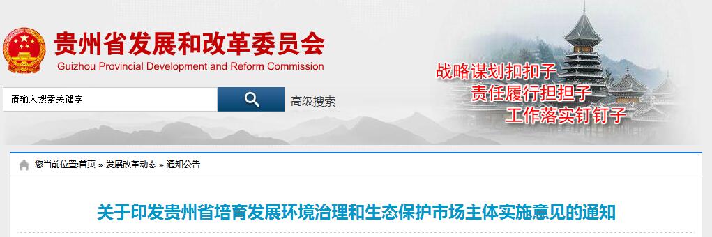貴州省發(fā)改委發(fā)布《關于印發(fā)貴州省培育發(fā)展環(huán)境治理和生態(tài)保護市場主體實施意見的通知》,提出: