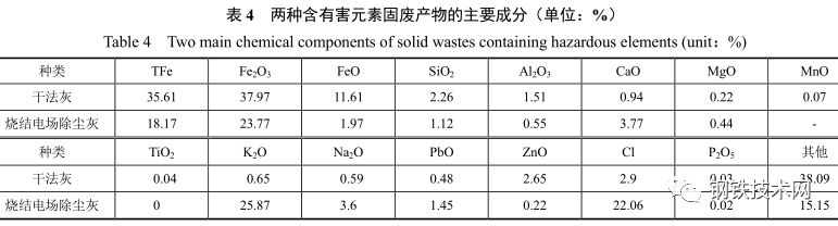 鋼廠每年產(chǎn)生含鉀、鈉、鋅等有害元素的固體廢棄物約 8.5 萬噸,表 4 是兩種典型產(chǎn)物的檢測成分。