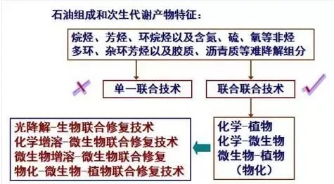 石油是烷烴、芳烴、環(huán)烷烴及含氮、硫、氧等非烴類組分的混合物,其中多環(huán)、雜環(huán)芳烴以及膠質、瀝青質等組分生物降解性較差。石油及次生代謝產的組成特征決定了修復的難度和復雜性。因此,單一聯(lián)合技術不能很好的解決污染問題時,需要考慮聯(lián)合使用各種處理技術。