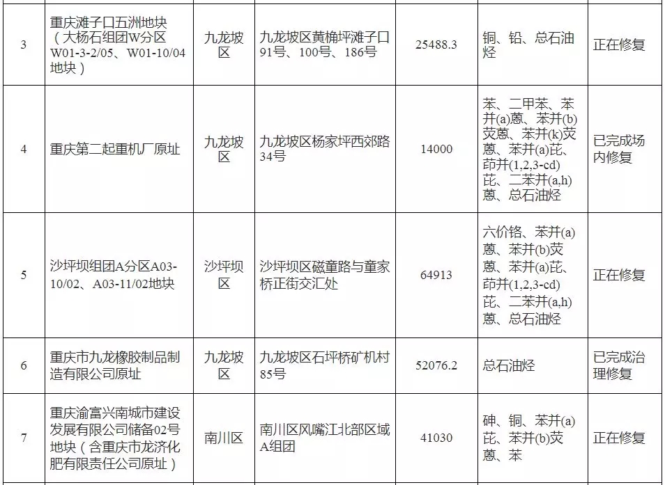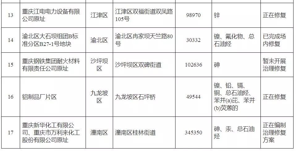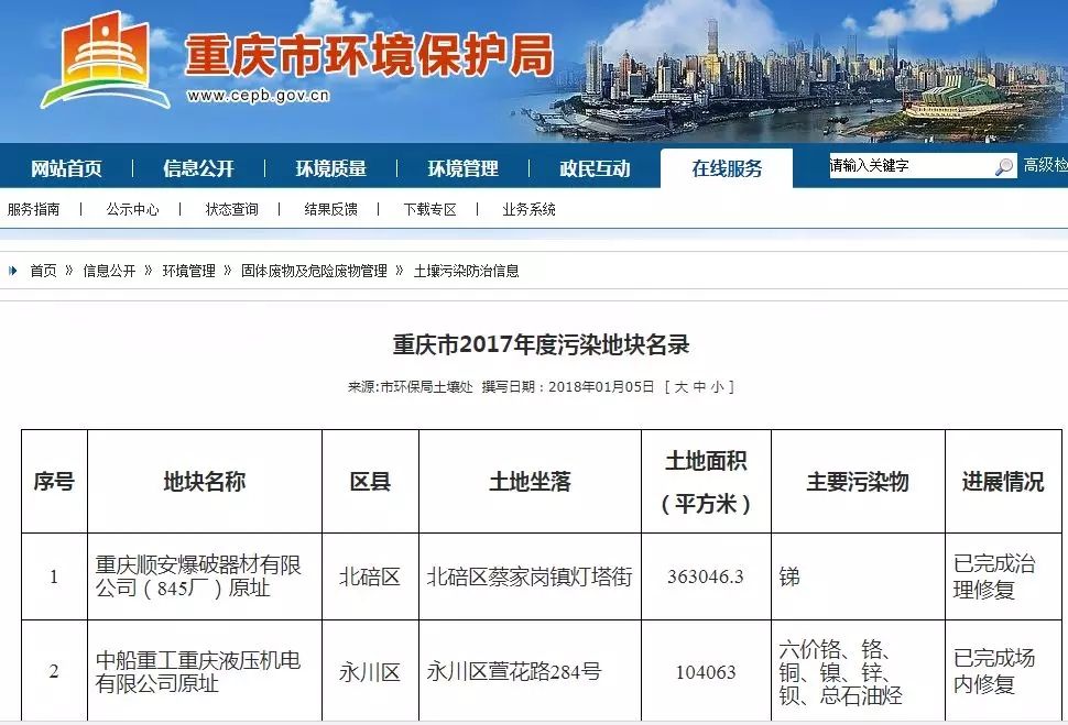 2018年1月5日 重慶市環(huán)境保護局公布了《重慶市2017年度污染地塊名錄》, 共有17塊污染地塊。