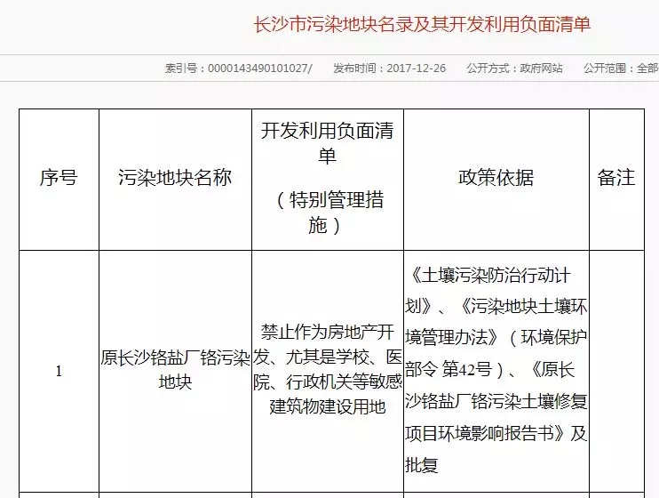 2017年12月26日 長沙市環(huán)境保護局公布了《長沙市污染地塊名錄及其開發(fā)利用負面清單》,共有6塊污染地塊。