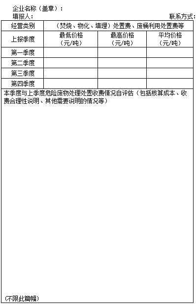 1.各危險廢物經(jīng)營單位從2018年1月起,結合每季度經(jīng)營情況季報,根據(jù)企業(yè)實際運營情況,按照附表2格式向市固廢管理中心如實報送每季度處理處置收費情況表;并于每年度1月31日前,上報上個年度危險廢物處理處置收費情況,參照附表1格式。