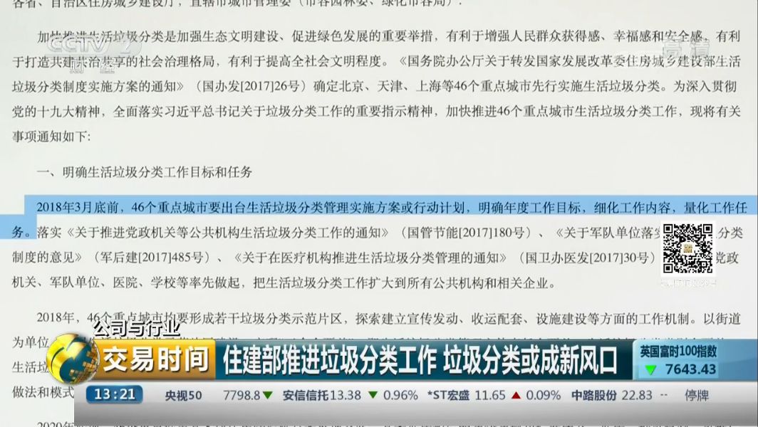 隨著2017年成為環(huán)保政策爆發(fā)年之后,環(huán)保板塊活躍度一度攀升,其中2017年7月18日至10月13日,節(jié)能環(huán)保指數(shù)上漲17.09%,跑贏同期上證綜指10.35個(gè)百分點(diǎn)。2017年底,住建部發(fā)文要求加快推進(jìn)46個(gè)重點(diǎn)城市的垃圾分類工作。那么垃圾的分類回收、處理會(huì)給企業(yè)帶來哪些新的商機(jī)呢?