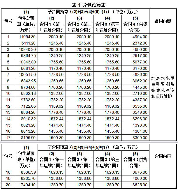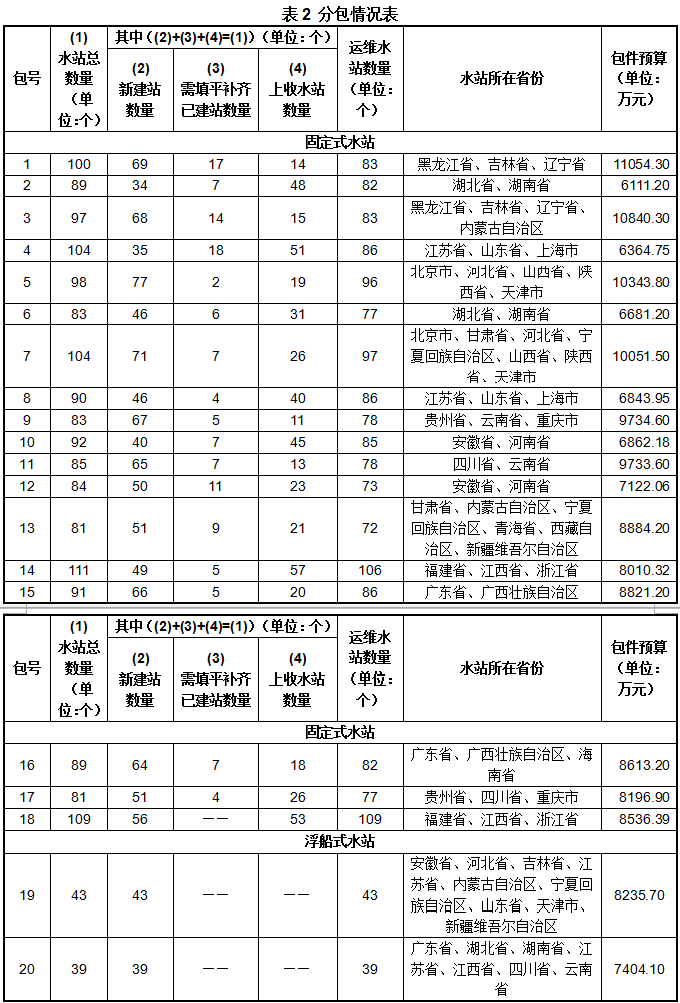 7. 招標(biāo)內(nèi)容為:招標(biāo)人計(jì)劃采購(gòu)1087個(gè)國(guó)家地表水自動(dòng)監(jiān)測(cè)站(以下簡(jiǎn)稱水站)的建設(shè)及其三年運(yùn)維服務(wù)、531個(gè)已建水站的三年運(yùn)維服務(wù)、135個(gè)國(guó)家已建水站的儀器設(shè)備填平補(bǔ)齊。其中,1~18包為固定式水站,19~20包為浮船式水站。具體要求詳見(jiàn)第四章技術(shù)需求書。