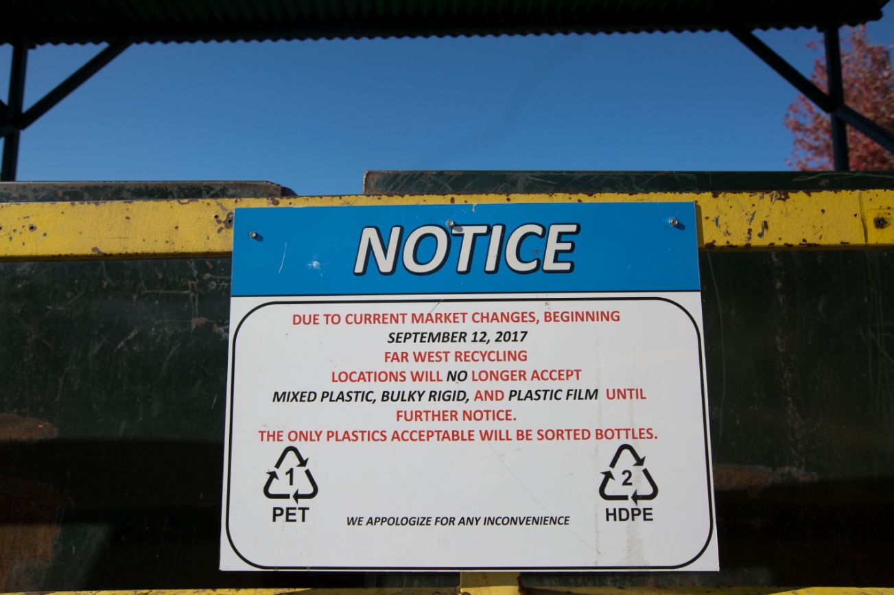 ▲美國希爾斯伯勒的垃圾回收站貼出了通知:因?yàn)槭袌鲎兓辉俳邮栈旌纤芰系?,唯一接收的塑料只是分選的塑料瓶。(視覺中國/圖)
