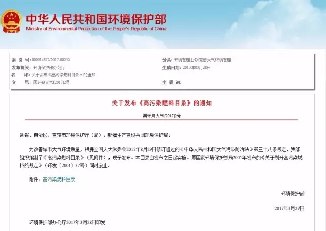 環(huán)境保護(hù)部印發(fā)《高污染燃料目錄》