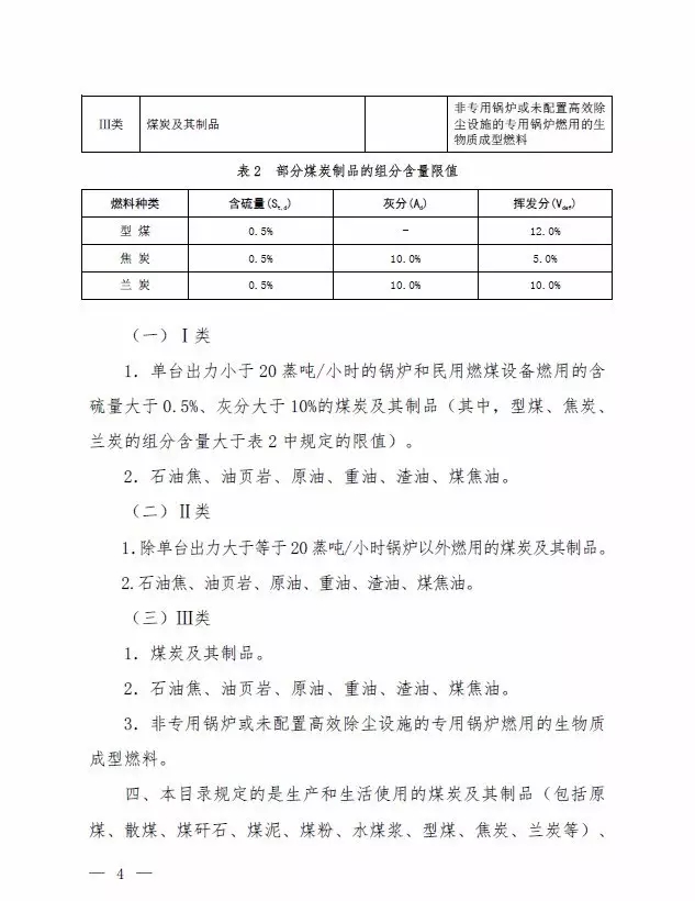 第Ⅰ類,考慮到中西部地區(qū)部分城市煤炭使用還存在規(guī)模化水平不高的現(xiàn)象,從鼓勵煤炭清潔利用角度,提出單臺出力小于20蒸噸/小時的鍋爐和民用燃煤設(shè)備燃用的含硫量大于0.5%、灰分大于10%的煤炭納入禁燃范圍。其中,型煤、焦炭、蘭炭的揮發(fā)分含量不能大于12%、5%和10%,對型煤的灰分含量沒有要求。