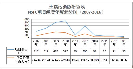 通過統(tǒng)計2007-2016十年內(nèi)我國國家自然科學(xué)基金的項(xiàng)目數(shù)據(jù),可知土壤污染防治領(lǐng)域的項(xiàng)目經(jīng)費(fèi)在2007-2010年呈穩(wěn)步上升趨勢,2010年申請通過的項(xiàng)目達(dá)峰值547個,2011年有所回落,2012年又激增到390個,之后幾年呈現(xiàn)了下降趨勢,2016年僅通過55個項(xiàng)目,經(jīng)費(fèi)也隨之下降,如圖9所示。