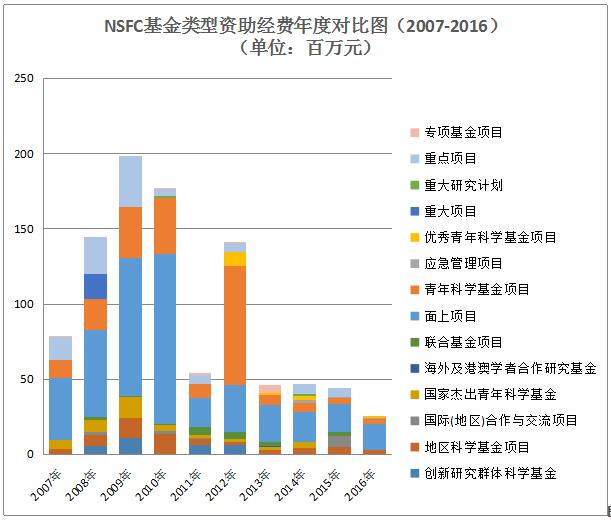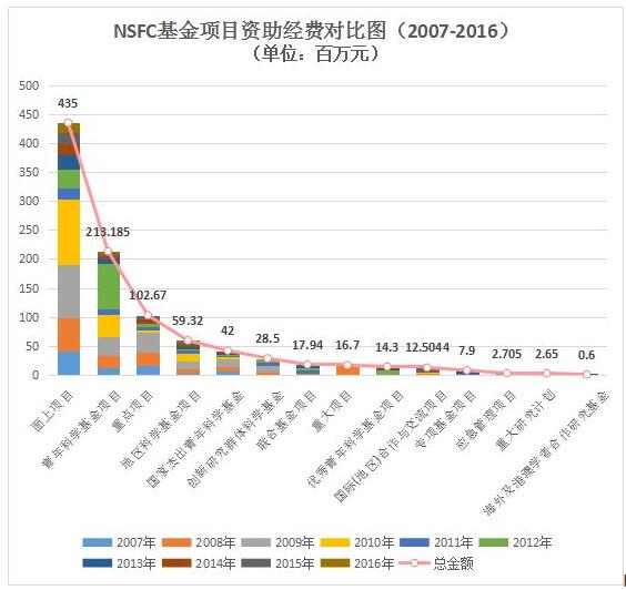 圖10國家自然科學(xué)基金項(xiàng)目資助經(jīng)費(fèi)對比圖(2007-2016年)