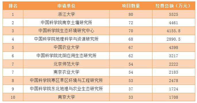 通過項(xiàng)目數(shù)據(jù)分析(見圖10),土壤污染防治領(lǐng)域在面上項(xiàng)目獲得的經(jīng)費(fèi)十年總經(jīng)費(fèi)額度排名第一,共計4.35億元,青年科學(xué)基金項(xiàng)目排名第二,約為2.13億元。排名第三位的為重點(diǎn)項(xiàng)目,共計1.02億元。面上項(xiàng)目是相對于重點(diǎn)項(xiàng)目而言,由于選題廣泛所以占比比其他類型要高。但是由于2013年起基金委出臺新政策,嚴(yán)格把控項(xiàng)目質(zhì)量。因此導(dǎo)致近幾年資助經(jīng)費(fèi)呈下降走勢。