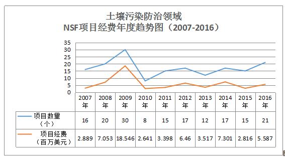 通過項(xiàng)目數(shù)據(jù)分析(見圖12),在土壤污染防治領(lǐng)域,美國國家科學(xué)基金資助經(jīng)費(fèi)在2007年至2009年呈現(xiàn)了穩(wěn)步遞增的趨勢,2009年項(xiàng)目數(shù)量達(dá)到峰值30個。2010年出現(xiàn)拐點(diǎn),項(xiàng)目數(shù)量下降為8個,2011年又開始回升,之后5年一直較為平穩(wěn),2016年有所增加,達(dá)到21個。