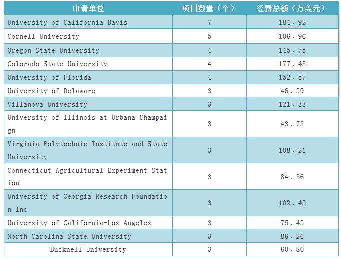 根據(jù)統(tǒng)計,本領(lǐng)域申請年份在2007年至2016年間,共有135個機(jī)構(gòu)申請了美國國家科學(xué)基金。其中申請數(shù)量超過2個的機(jī)構(gòu)有14個獲得經(jīng)費(fèi)約為1496.8萬美元,如表9所示。