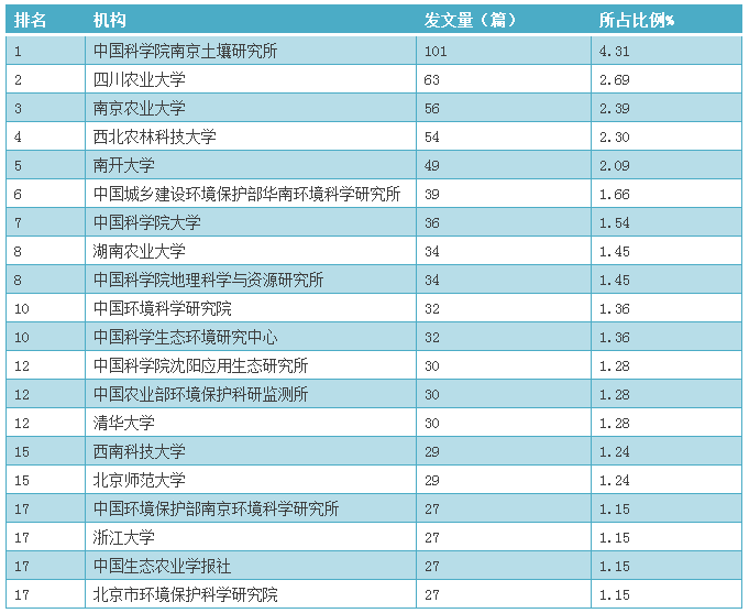 截至2016年發(fā)表的土壤污染防治相關(guān)研究論文中,發(fā)文量位居前20位的科研機(jī)構(gòu)或單位見表5。中國科學(xué)院南京土壤研究所發(fā)文量101篇,以絕對(duì)性優(yōu)勢(shì)居榜首,四川農(nóng)業(yè)大學(xué)以63篇發(fā)文居第二,南京農(nóng)業(yè)大學(xué)以7篇之差位列第三。前20位的機(jī)構(gòu)中,共有10所高校入圍,其中4所是農(nóng)業(yè)類院校;科研機(jī)構(gòu)有9個(gè)入圍。可見,高校和科研機(jī)構(gòu)是我國研究土壤污染防治的主力軍。