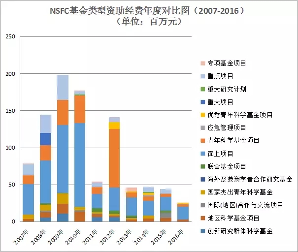 圖11 國家自然科學(xué)基金基金類型資助經(jīng)費(fèi)年度對(duì)比圖(2007-2016年)