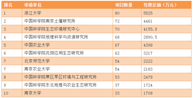 通過項(xiàng)目數(shù)據(jù)分析(見圖10),土壤污染防治領(lǐng)域在面上項(xiàng)目獲得的經(jīng)費(fèi)十年總經(jīng)費(fèi)額度排名第一,共計(jì)4.35億元,青年科學(xué)基金項(xiàng)目排名第二,約為2.13億元。排名第三位的為重點(diǎn)項(xiàng)目,共計(jì)1.02億元。面上項(xiàng)目是相對(duì)于重點(diǎn)項(xiàng)目而言,由于選題廣泛所以占比比其他類型要高。但是由于2013年起基金委出臺(tái)新政策,嚴(yán)格把控項(xiàng)目質(zhì)量。因此導(dǎo)致近幾年資助經(jīng)費(fèi)呈下降走勢(shì)。
