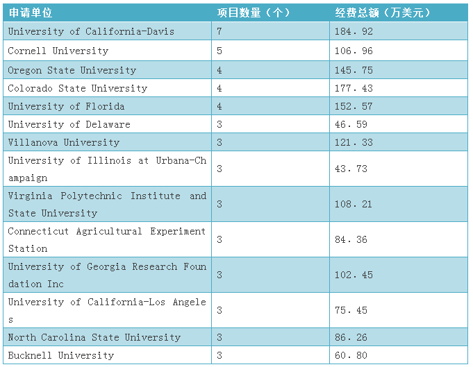 根據(jù)統(tǒng)計(jì),本領(lǐng)域申請(qǐng)年份在2007年至2016年間,共有135個(gè)機(jī)構(gòu)申請(qǐng)了美國國家科學(xué)基金。其中申請(qǐng)數(shù)量超過2個(gè)的機(jī)構(gòu)有14個(gè)獲得經(jīng)費(fèi)約為1496.8萬美元,如表9所示。