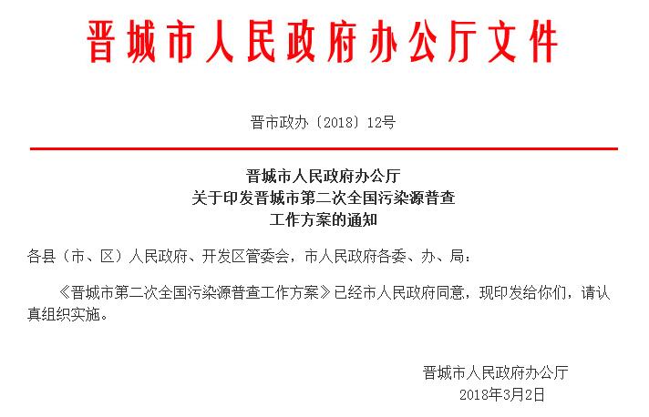 日前山西省晉城市人民政府辦公廳印發(fā)了《 晉城市第二次全國(guó)污染源普查工作方案》,全文如下: