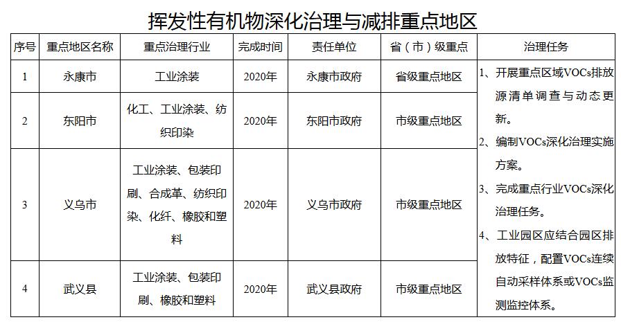 重點(diǎn)推進(jìn)化工、工業(yè)涂裝、包裝印刷、橡膠和塑料制品、化纖、紡織印染、合成革、制鞋等行業(yè)VOCs污染防治。永康、東陽、義烏、武義等4個(gè)省、市重點(diǎn)地區(qū)要編制地區(qū)VOCs深化治理方案。重點(diǎn)企業(yè)要建立完善“一廠一策一檔”制度。