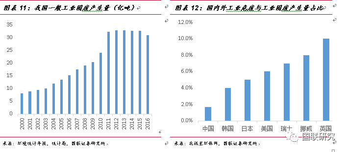 危廢實(shí)際產(chǎn)生量遠(yuǎn)高于生態(tài)環(huán)境部統(tǒng)計(jì)值。對(duì)于我國(guó)危廢實(shí)際產(chǎn)生量,我們認(rèn)為可以采用以下兩種方式進(jìn)行測(cè)算:①對(duì)比發(fā)達(dá)國(guó)家危廢產(chǎn)量測(cè)算法:2007-2016年我國(guó)一般工業(yè)固廢產(chǎn)量由17.6億噸增長(zhǎng)到30.9億噸,年復(fù)合增長(zhǎng)率為6.45%。對(duì)比部分發(fā)達(dá)國(guó)家的危廢與工業(yè)固廢占比可以發(fā)現(xiàn),韓國(guó)為4%,日本5%,英國(guó)比例最高為10%,而中國(guó)的比例僅為1.7%,差距較為明顯。即使按照韓國(guó)4%的危廢占工業(yè)固廢比例進(jìn)行保守測(cè)算,2016年我國(guó)危廢實(shí)際產(chǎn)量預(yù)估將達(dá)1.24億噸。
