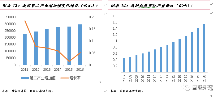 ②第二產(chǎn)業(yè)增加值測(cè)算法:由于危廢排放的企業(yè)多數(shù)來自于化工、有色等中游制造企業(yè),我們認(rèn)為危廢的實(shí)際產(chǎn)生量將與第二產(chǎn)業(yè)的景氣度是呈現(xiàn)正相關(guān)性。2007年至2016年,我國(guó)第二產(chǎn)業(yè)的增加值由11.58萬億元增長(zhǎng)到29.65萬億元,復(fù)合增長(zhǎng)率達(dá)9.91%,2007年污染源第一次普查時(shí)危廢實(shí)際產(chǎn)量為4573萬噸,在默認(rèn)普查數(shù)據(jù)為準(zhǔn)確數(shù)據(jù)的情況下,按照9.91%的危廢增長(zhǎng)速率進(jìn)行測(cè)算,2016年我國(guó)危廢實(shí)際產(chǎn)生量將達(dá)到1.07億噸。