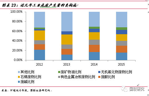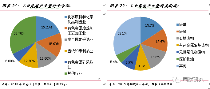 工業(yè)危廢的主要來源及種類構(gòu)成。鑒于對(duì)危險(xiǎn)廢物的認(rèn)識(shí)不斷深入,在2016年6月21日,生態(tài)環(huán)境部重新修訂了《國(guó)家危險(xiǎn)廢物名錄》,將危廢由49大類重新調(diào)整為46大類,新增117種類別,共計(jì)479種,而其中70%以上的危廢都來自于工業(yè)行業(yè)。據(jù)2015年環(huán)境統(tǒng)計(jì)年報(bào)數(shù)據(jù)統(tǒng)計(jì),工業(yè)危廢中產(chǎn)量最大的行業(yè)分別為化學(xué)原料與化學(xué)制品制造業(yè)(占比19.2%)、有色金屬冶煉和壓延加工(占比15.6%)、非金屬礦采選業(yè)(占比13.8%)以及造紙和紙制品業(yè)(占比12.7%)。