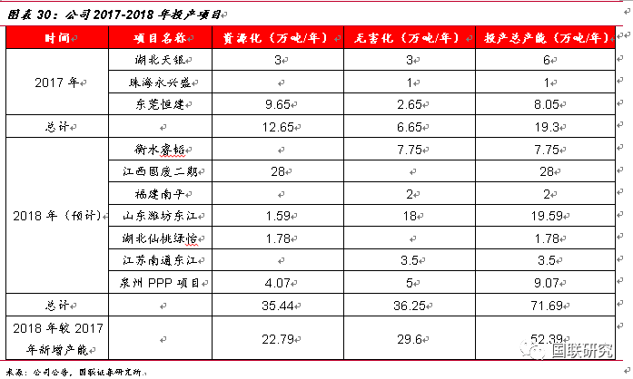 大量項(xiàng)目即將落地投產(chǎn),危廢處理能力持續(xù)增強(qiáng)。根據(jù)公司2017年年報(bào)披露數(shù)據(jù),2017年公司共建成項(xiàng)目有湖北天銀(無害化3萬噸/年,資源化3萬噸/年)、珠海永興盛(無害化1萬噸/年)、東莞恒建(無害化2.65萬噸/年、資源化9.65萬噸/年),2017年新增總產(chǎn)能達(dá)19.3萬噸/年。2018年預(yù)計(jì)能夠投產(chǎn)的項(xiàng)目包括衡水睿稻(無害化7.75萬噸/年)、江西固廢二期(資源化28萬噸/年)、福建南平(無害化2萬噸/年)、山東濰坊東江(無害化1.59萬噸/年,資源化18萬噸/年)、湖北仙桃綠怡(資源化1.78萬噸/年)、江蘇南通(無害化3.5萬噸/年)、泉州PPP項(xiàng)目(無害化5萬噸/年、資源化4.07萬噸/年),2018年預(yù)計(jì)總產(chǎn)能達(dá)71.69萬噸/年。