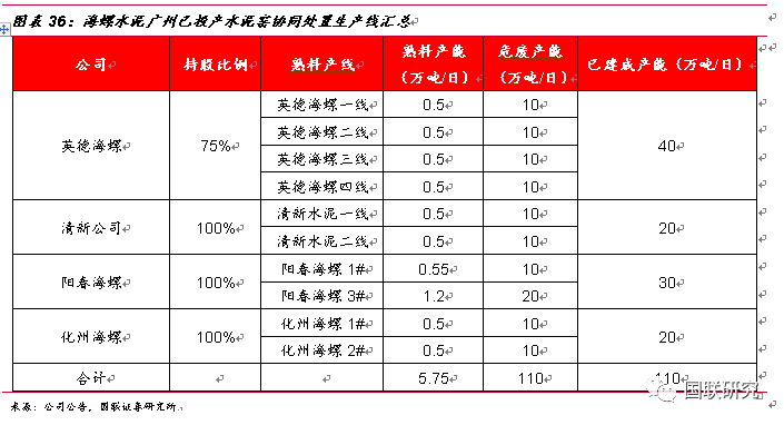 以廣東省為試點(diǎn),公司攜手海螺創(chuàng)業(yè)深耕危廢領(lǐng)域。公司與海螺創(chuàng)業(yè)將以包括但不限于股權(quán)合作的方式進(jìn)行廣東省水泥窯協(xié)同處置固廢布點(diǎn),包括但不限于以《廣東省環(huán)境保護(hù)“十三五”規(guī)劃》和《廣東省水泥行業(yè)轉(zhuǎn)型升級(jí)技術(shù)路線和行動(dòng)計(jì)劃(2016-2018年)》為指導(dǎo)。根據(jù)“十三五”期間規(guī)劃要求,廣東省水泥窯協(xié)同處置危廢產(chǎn)能為500萬噸/年,據(jù)海螺水泥公司公告統(tǒng)計(jì),其在廣東省內(nèi)共計(jì)有4家子公司,分別為英德海螺、清新水泥、化州海螺以及陽春海螺,共計(jì)10條投產(chǎn)線,已建成熟料產(chǎn)能分別為2萬噸/日、1萬噸/日、1萬噸/日以及1.75萬噸/日,若全部完成協(xié)同改造,危廢產(chǎn)能總計(jì)將達(dá)110萬噸/年。