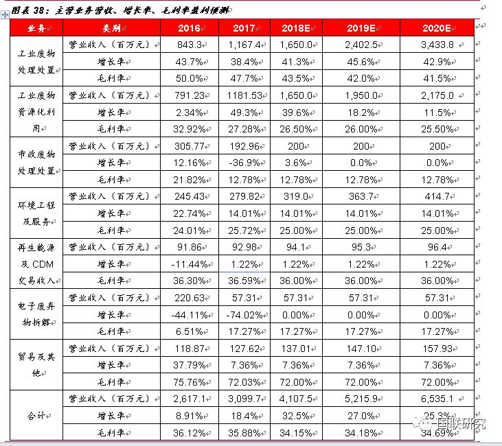 1.河北衡水睿韜項(xiàng)目(無害化)、江西固廢二期(資源化)、福建南平(無害化)、山東濰坊東江(無害化+資源化)、湖北仙桃綠怡(資源化)、江蘇南通(無害化)、泉州PPP項(xiàng)目(無害化+資源化)項(xiàng)目于2018年建成并投產(chǎn)使用。2018-2020年無害化產(chǎn)能分別為110萬噸、155萬噸、205萬噸。2.考慮到后期有部分項(xiàng)目進(jìn)行技術(shù)升級(jí)改造,以及公司正在加大物化業(yè)務(wù)市場(chǎng)拓展和資質(zhì)匹配,2018-2020年產(chǎn)能利用率按照60%、62%、65%進(jìn)行測(cè)算。3.由于目前危廢處置仍然存在較大的供需缺口,暫不考慮價(jià)格因素對(duì)公司收入的影響,無害化處置價(jià)格2018-2020年全部按照2500元/噸進(jìn)行預(yù)測(cè)。4.由于自2016年10月開始大宗商品價(jià)格有所回暖,近期趨于穩(wěn)定,根據(jù)上海金屬網(wǎng)價(jià)格顯示,金屬銅2016-2017年均價(jià)上漲28%,預(yù)計(jì)2017-2020年資源化產(chǎn)品價(jià)格增幅分別為14%、0%、0%、0%,均價(jià)全部按照1500元/噸進(jìn)行計(jì)算,2018-2020年資源化產(chǎn)能按照110萬噸、130萬噸、145萬噸計(jì)算。5.保守起見,暫不考慮參股海螺創(chuàng)業(yè)帶來的收入影響。