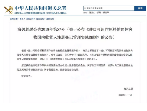 6月15日,海關(guān)總署發(fā)布今年第57號文件,根據(jù)《進(jìn)口可用作原料的固體廢物檢驗(yàn)檢疫監(jiān)督管理辦法》,海關(guān)總署制定了《進(jìn)口可用作原料的固體廢物國內(nèi)收貨人注冊登記管理實(shí)施細(xì)則》,現(xiàn)予以公告,自2018年8月1日起執(zhí)行。《進(jìn)口可用作原料的固體廢物國內(nèi)收貨人注冊登記管理實(shí)施細(xì)則(試行)》(原質(zhì)檢總局公告2009年第91號公布)同時廢止。