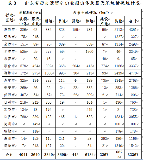 全省露天開采礦種主要有石灰?guī)r、花崗巖、磚瓦用粘土等非金屬建筑材料礦產(chǎn),在開采過程中造成了地形地貌景觀破壞,也占壓和損毀了大量的土地資源。目前,全省尚有破損山體4706處、露天采坑3109處,占損土地資源總計4.28萬公頃。其中,歷史遺留礦山破損山體4041處、露天采坑2640處,占損土地資源3.24萬公頃,主要分布在濟(jì)南、煙臺、濰坊、臨沂等地(表3);生產(chǎn)礦山造成的破損山體665處、露天采坑469處,占損土地資源1.04萬公頃,主要分布在煙臺、泰安、臨沂等地。