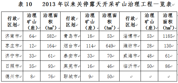 2013年以來全省關(guān)停露天開采礦山1539座,已治理礦山267座,未治理礦山1272座。部署到2020年治理礦山518座,治理面積0.33萬公頃(含“三區(qū)兩線”可視范圍內(nèi)歷史遺留礦山0.09萬公頃),主要分布于濟(jì)南、淄博、煙臺等地(表10)。