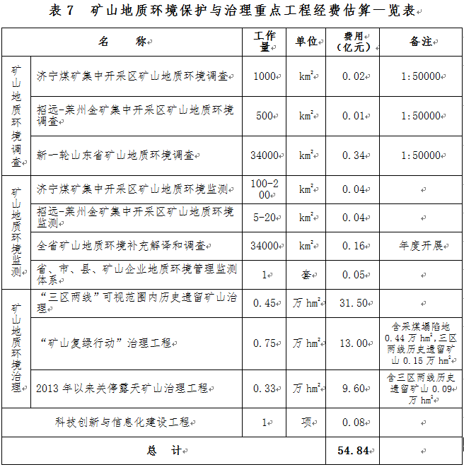 在濟(jì)寧煤礦集中開采區(qū)、招遠(yuǎn)-萊州金礦集中開采區(qū)開展礦山地質(zhì)環(huán)境專項調(diào)查,在全省開展新一輪礦山地質(zhì)環(huán)境詳細(xì)調(diào)查。調(diào)查費用估算為0.37億元。