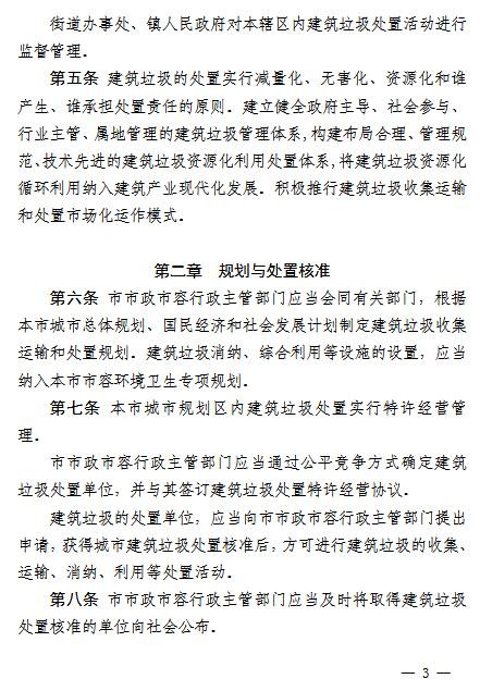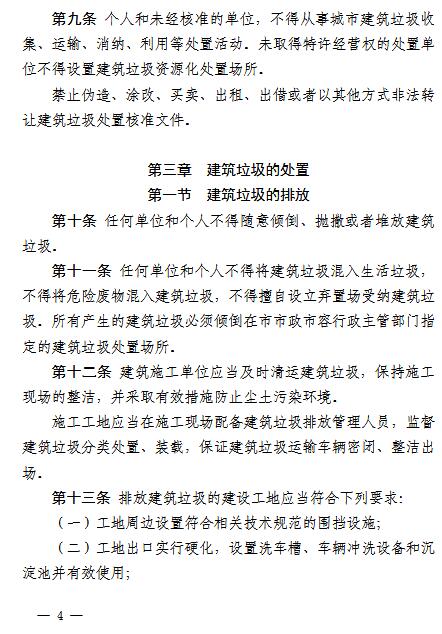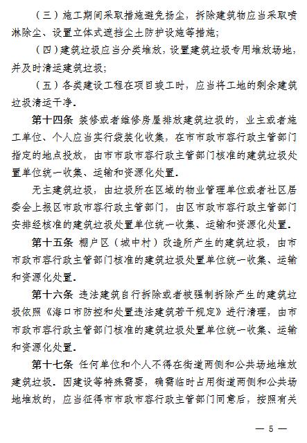 《辦法》要求,在建筑垃圾的排放上,任何單位和個人不得隨意傾倒、拋撒或者堆放建筑垃圾,不得將建筑垃圾混入生活垃圾,不得將危險廢物混入建筑垃圾,不得擅自設立棄置場受納建筑垃圾。因建設等特殊需要,確需臨時占用街道兩側和公共場地堆放的,應當征得海口市市政市容行政主管部門同意后,按照有關規(guī)定辦理審批手續(xù)。裝修或者維修房屋排放建筑垃圾的,應當實行袋裝化收集;無主建筑垃圾,由垃圾所在區(qū)域的物業(yè)管理單位或者社區(qū)居委會上報各區(qū)市政市容行政主管部門;棚戶區(qū)(城中村)改造所產生的建筑垃圾,由??谑姓腥菪姓鞴懿块T核準的建筑垃圾處置單位統(tǒng)一收集、運輸和資源化處置。