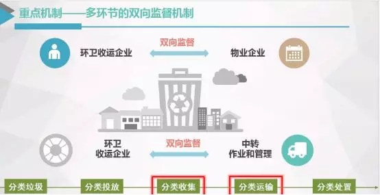 在分類收集和分類運輸環(huán)節(jié)上,實施多環(huán)節(jié)的雙向監(jiān)督機制。對小區(qū)物業(yè)要求分類駁運,對源頭分類進行監(jiān)督,對環(huán)衛(wèi)分類清運雙向監(jiān)督。環(huán)衛(wèi)清運企業(yè)按照清運要求,對前面分類投放及后端的中轉作業(yè)、管理進行分類駁運的監(jiān)督,是雙向的監(jiān)督機制。