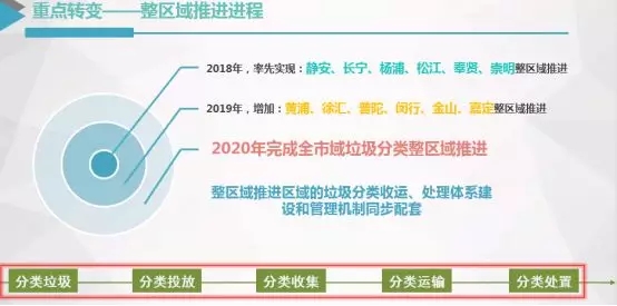 在原來一個小區(qū)、一個單位零散推進的基礎上,實施整街鎮(zhèn)或整行政區(qū)推進垃圾分類,構建既完整又具有規(guī)?;氖占\輸處置管理鏈。2018年靜安、長寧、楊浦、松江、奉賢、崇明6個區(qū)實現(xiàn)整區(qū)域推進,2019年黃浦、徐匯、普陀、閔行、嘉定、金山6個區(qū)實現(xiàn)整區(qū)域推進,2020年全市全面實現(xiàn)整區(qū)域推進。