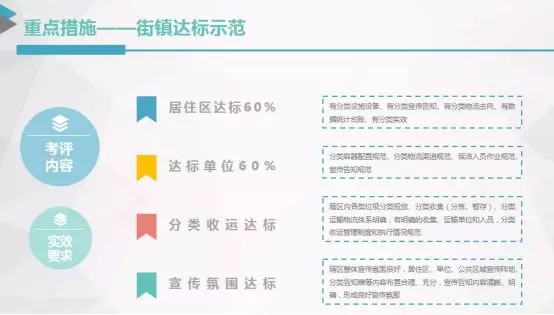 根據(jù)《上海市生活垃圾分類達標、示范街道(鎮(zhèn)、鄉(xiāng))考評辦法(試行)》,要成為生活垃圾分類達標街鎮(zhèn),其轄區(qū)內60%的居住區(qū)和單位先要達標,轄區(qū)內各類垃圾的分類投放、收集(分揀、暫存)、運輸物流體系明確,還要建立垃圾分類領導和協(xié)調機制,落實居住區(qū)垃圾分類居委、物業(yè)、業(yè)主、第三方的責任人和所負責任。成為生活垃圾分類示范街鎮(zhèn)的門檻更高,轄區(qū)內80%的居住區(qū)和單位生活垃圾分類實效要達標。