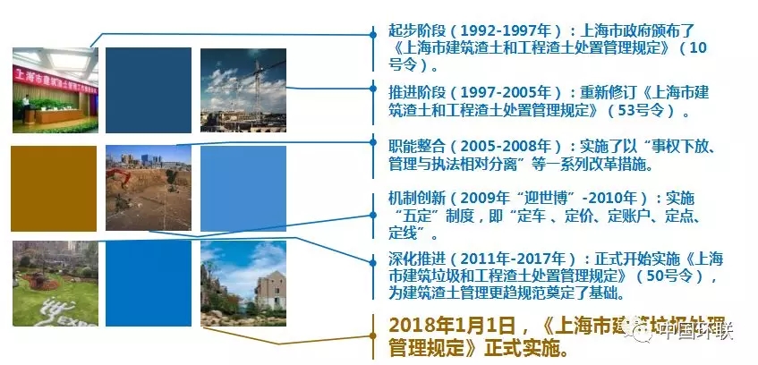 1992年,上海成立上海市渣土管理處,同年頒布《上海市建筑渣土和工程渣土處置管理規(guī)定》(10號令),這標(biāo)志著上海市將建筑垃圾納入管理范疇。