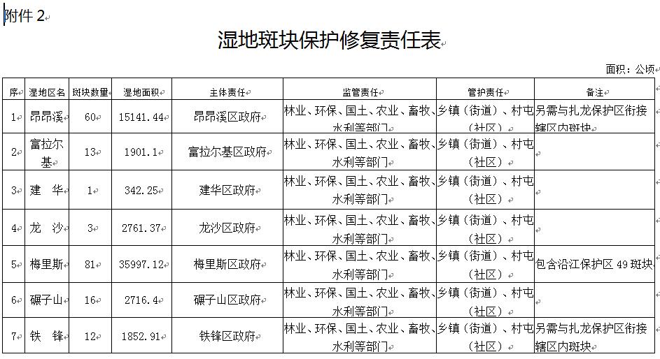 《齊齊哈爾市2018-2020年濕地保護修復實施方案》日前印發(fā),并隨文公布了自然保護區(qū)綠盾督察專項行動匯總表、濕地斑塊保護修復責任表、2018年省級以上自然保護區(qū)耕地清理任務安排表。詳情如下: