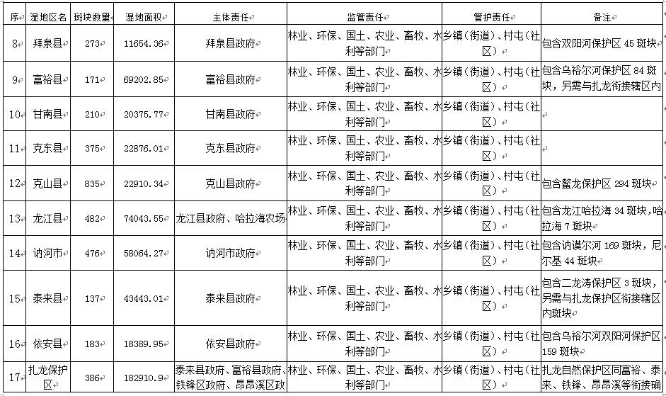 1.組織核實認領濕地斑塊。以2016年12月28日省政府公布的《黑龍江省濕地名錄》為依據(jù),各縣(市)區(qū)政府要組織核實認領本行政區(qū)域內的濕地斑塊,并把管控目標逐級分解落實到鄉(xiāng)鎮(zhèn)(街道)、村屯(社區(qū)),確保全市濕地斑塊落到實處。2019年底前,建立本區(qū)域內濕地名錄臺賬。扎龍國家級自然保護區(qū)要組織核實認領本保護區(qū)內的濕地斑塊,并與當?shù)卣暯哟_認?!藏熑螁挝唬焊骺h(市)區(qū)政府、扎龍國家級自然保護區(qū)管理局、省農墾總局九三管理局〕